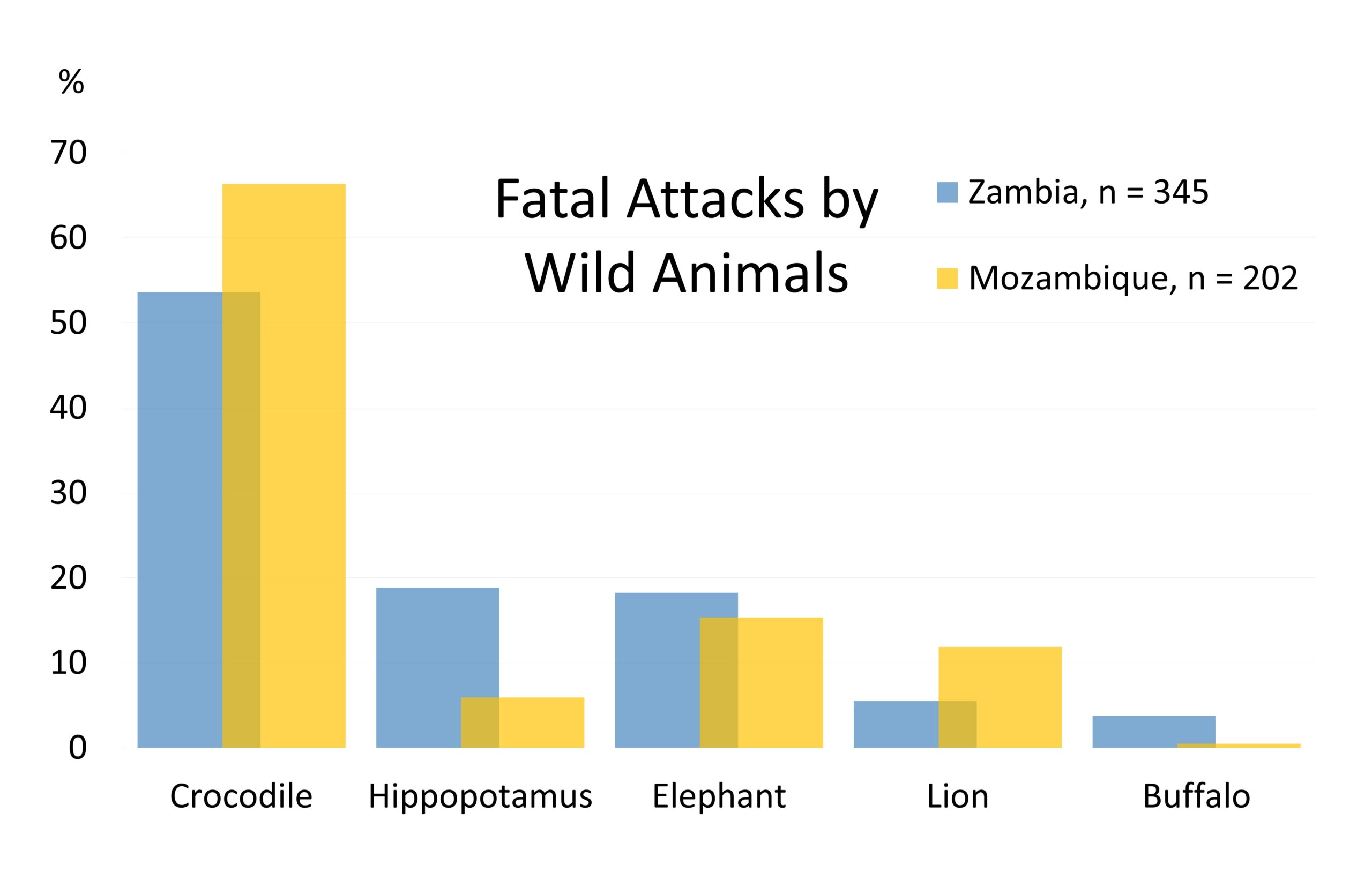 While Zambia, a country with extensive lake and swamp regions, hosts the largest hippopotamus population in the world, neighboring Mozambique – also situated along the Zambezi River but predominantly savanna – has proportionally more other species of dangerous wild animals. Since hippopotamuses occur only in a few water-rich regions of Africa and most of the continent is covered by dry savannas and deserts, the data from Mozambique more clearly represent the overall situation. Even if their dangerousness may sometimes be somewhat exaggerated, both rankings show clearly that caution is required around them.